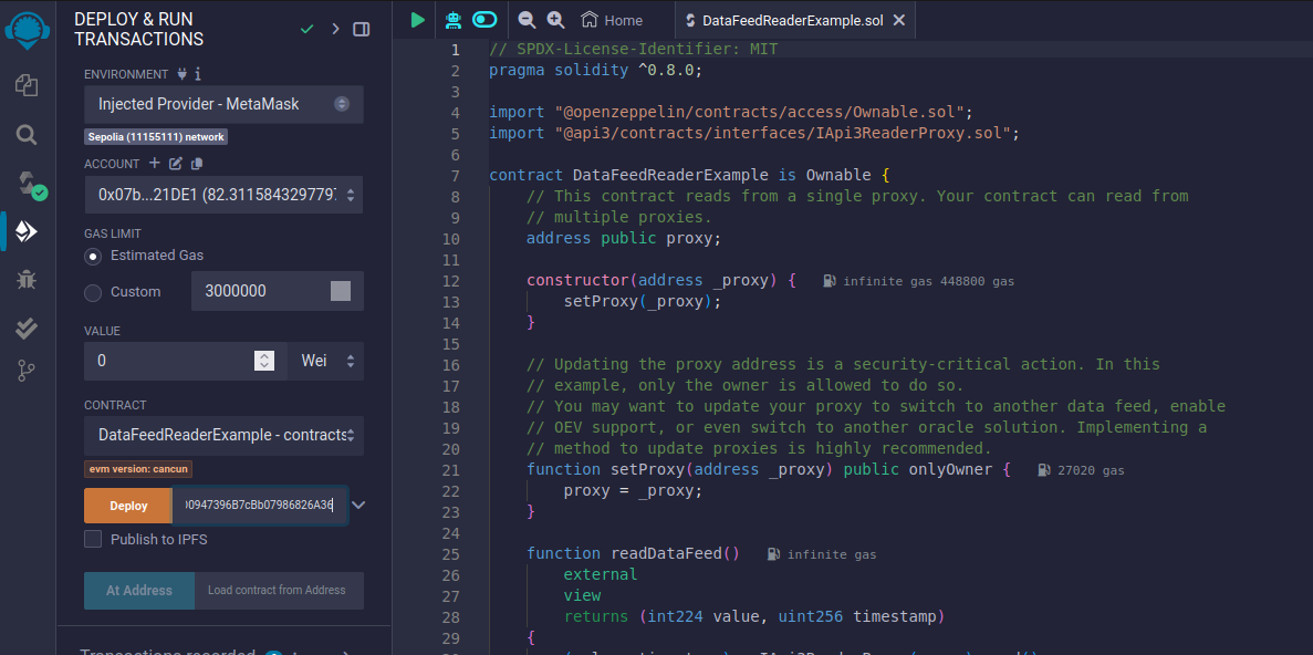Return to Remix IDE. With the "Deploy & run transactions" tab selected on the left sidebar, paste the Api3ReaderProxyV1 address into the textbox next to the "Deploy" button, then click the button.